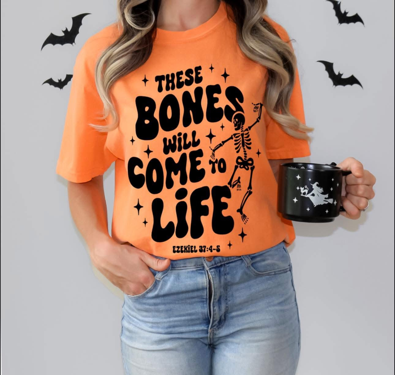 This tshirt features the Bible verse "These bones will come to life" (Ezekiel 37: 4-5), perfect for Halloween. Embrace your Christian faith while celebrating the holiday.